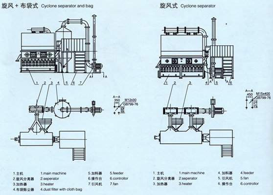 注:干燥能力以干燥酸梅晶初含水份20%,終含水份5%,進風溫度計130℃時測定,其它物料的干燥能力按具體干燥情況為準,選型時注意A型:配旋風分離器;B型:內(nèi)袋式;C型:既帶旋風,又帶布袋除塵器。